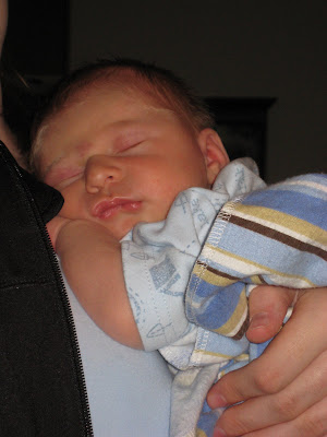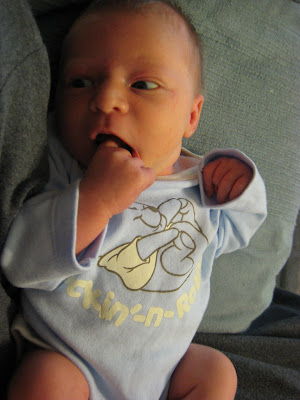 Last Tuesday he had another check-up. He weighed in at 8 lbs, 7.5 ozs - a significant change from the 7 lbs, 9 ozs from the previous Monday! We know that he is getting enough to eat too - some days I am feeding him every hour during the day!
