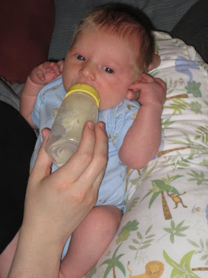 Since I will likely be back at work in three more weeks, I am starting to pump so that Ben can adjust to having some bottle feedings. Today he had his first bottle and he took to it like a pro! He gulped down a 3 ounce portion without any hesitation.