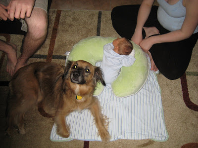 Both Sadie and Perry like to be around Ben to guard him, especially during tummy time.